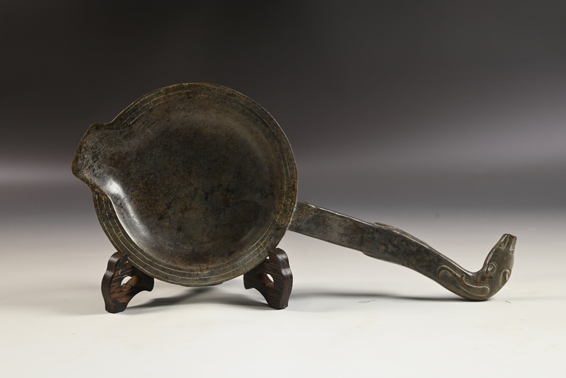 白玉灰皮黑沁龙首长颈灯盏